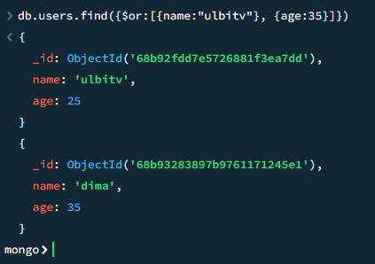 db.users.find({$or:[{name:"ulbitv"}, {age:35}]})