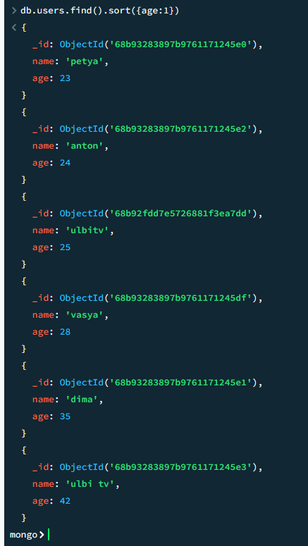 db.users.find().sort({age:1})